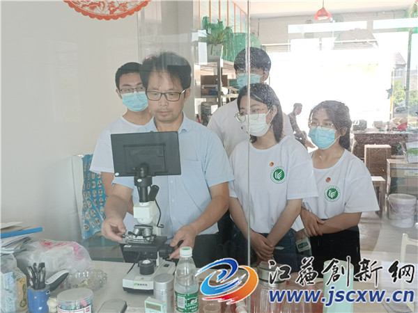 成员在镇江市劳模洪玉定研究员的协助下,分别走进句容市后白镇、郭庄镇、天王镇和下蜀镇等主要水产养殖区,调研了青虾、小龙虾、草鱼、甲鱼、大鲵和鲟鱼等品种的养殖现状,开展水质检测、病害分析等服务,发放了小龙虾、河蟹等养殖技术手册,宣讲了稻虾共作、鱼菜共生等生态养殖模式。
