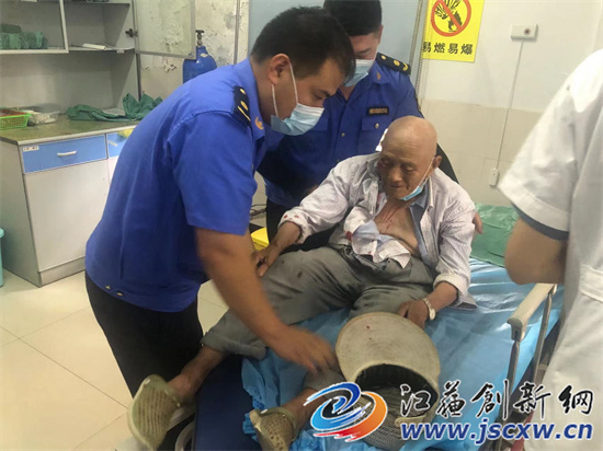 江苏创新网讯 7月19日,在句容市后白镇天爱桥下上演了温暖一幕,一名96岁的老人摔倒路边,挣扎难起,句容市城管局乡镇执法大队后白中队的队员发现后,伸手相扶,并将他送往医院。