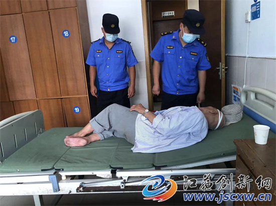 “有老人摔倒在花坛边了,流了好多血,赶紧搭把手送去医院!”当天上午9点左右,句容市城管局乡镇执法大队后白中队的巡查队员张冬、苏盼盼在街上巡查时,发现后白镇天爱桥下的花坛边躺着一位满脸是血的老人,两人立即上前询问情况。
