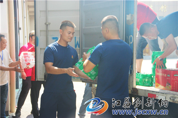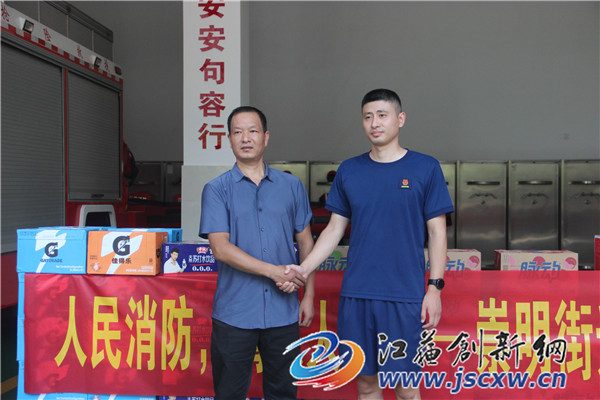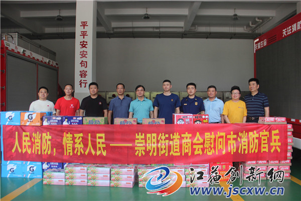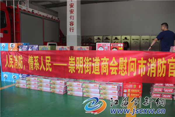 崇明街道商会表示:感谢消防救援人员一直以来对句容经济社会发展各项工作的支持,对他们高温酷暑守寸土、不顾安危保平安以及对人民财产安全作出的贡献表示崇高的敬意,赠送一点物资表示感谢,希望大家能够保持身体健康,守护好句容。