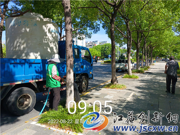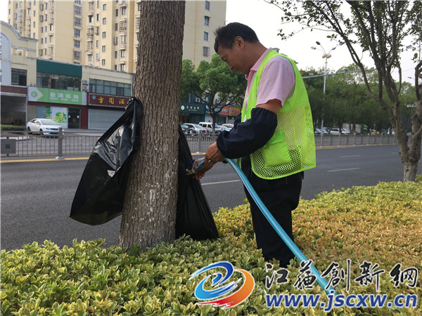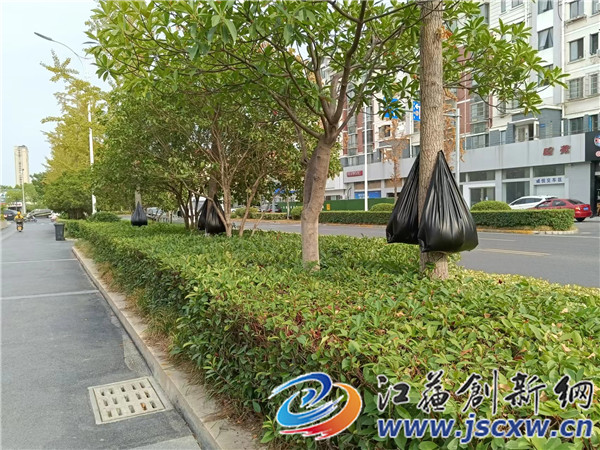 江苏创新网讯 近日,不少市民行走在句容城区的主次干道上时,都可以看到整齐划一的树根处,园林绿化工人正将一只只黑色的塑料袋拴在一棵棵行道树根处,随后用水枪向塑料袋内注入液体,不一会儿塑料袋就鼓了起来。然后,工作人员将塑料袋尾部用针戳一个小洞,水流顺着塑料袋自然的一滴滴渗入土壤。