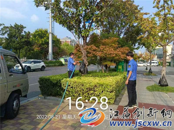 “这项工作主要是为了抗旱保绿,采用滴灌的方式对干旱的树木进行精准浇水,浇灌的树木主要为银杏树、白玉兰、广玉兰等,每个滴灌袋能装10升水,平均速度流完大概要6-8个小时,滴灌袋可重复加水利用。句容城区涉及行道树大概5000余棵,滴灌对象是一些名贵树种和不耐旱树种,不是所有的树木都要采取滴灌技术,主要视路段土壤墒情而定。”句容市城管局园林管理中心副主任杨云峰告诉记者,此项工作是在19日开始的,从现场情况来看效果比较理想。