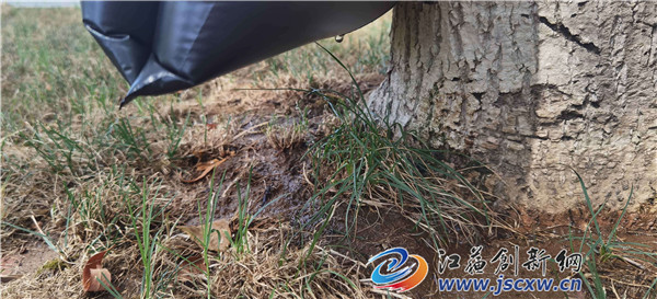 滴灌袋内装的液体究竟是什么?是给树木上肥料,还是治疗病虫害,抑或是为了抗旱?对此,记者从句容市园林管理中心了解到,持续高温天气不仅让人感到不适,一些园林植物也出现了“日灼”现象,为保护树木正常生长,在水源紧张的情况下,园林部门正采取缓释滴灌技术对部分树木进行抗旱浇灌。