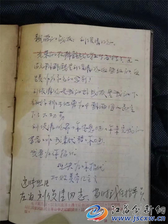 今年65岁的费粤博介绍,爸爸告诉她,刘俊清叔叔是吉林通化人,家住通化火车站附近。他们每天在一起训练,结下了深厚的友谊。奔赴朝鲜前,爸爸跟着刘叔叔回了一趟家,见到了刘叔叔的家人。刘叔叔家有父亲、母亲,还有两个妹妹。两个妹妹扎着小辫子,很可爱。他们在家里吃了一顿米饭,要离开的时候,刘叔叔的两个妹妹都哭了,他们不舍得哥哥走。在抗美援朝战场上,费晓成担任连指导员,刘俊清担任排长,他们一起负责运送物资到前线。1951年7月的一天,他们遇到了敌人的猛烈轰炸。费晓成从车上下来后,有个战士跑到他面前,喘着气说:“刘俊清负伤了。”费晓成跑到刘俊清身边,发现他被炮弹击中腹部,全身都是血。“二排长,你坚持住!”费晓成抱着刘俊清喊道。但此时,刘俊清已很虚弱,他用最后一口气说:“指导员,你回国的时候,跟我爸爸妈妈讲,我在朝鲜牺牲了……”随后,刘俊清把手伸进裤兜里,想往外掏什么。可还没有完全掏出来,刘俊清就牺牲在了费晓成的怀里。“后来,爸爸顺着他的手去摸,摸出来一张带血的朝鲜纸币,爸爸说拿出来的时候还在滴着血。”费粤博说,那一刻,爸爸非常心痛,当天,他将刘叔叔就地掩埋之后,在战场上写下了一篇日记:亲爱的战友刘俊清同志,光荣地在朝鲜战场上牺牲了,这一百元朝鲜钱,是刘俊清同志血染红的……刘俊清同志,你安息吧,你未完成的革命工作,我来代替你吧。我要为你报仇,坚决为你报仇,打败美帝国主义!刘俊清把年轻的生命留在了异国他乡。将这张浸透鲜血的朝鲜纸币交给他的家人,就成了费晓成最大的心愿。