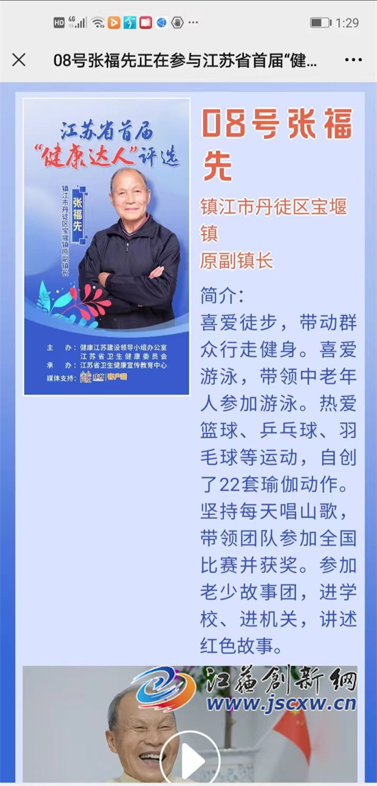 在江苏省卫生健康委员会“健康达人”组委会的网页中介绍张福先:张福先,喜爱徒步,带动群众行走健身。喜爱游泳,带领中老年人参加游泳。热爱篮球、乒乓球、羽毛球等运动,自创了22套瑜伽动作。坚持每天唱山歌,带领团队参加全国比赛并获奖。参加老少故事团,进学校、进机关,讲述红色故事。为此,本报记者在28日下午专门采访了张福先老人。