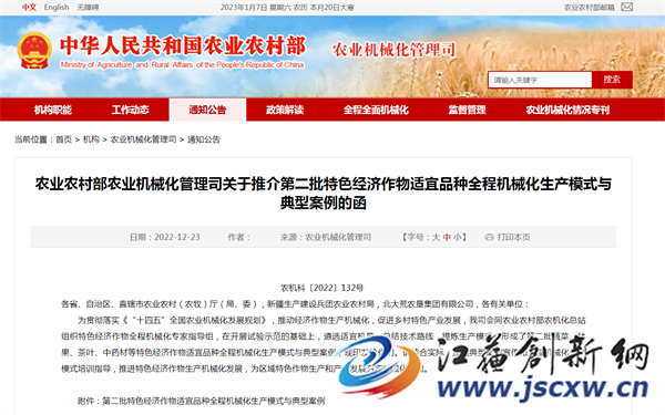 江苏创新网讯 2022年12月22日,国家农业农村部农业机械化管理司以农机科〔2022〕132号文,向各省、自治区、直辖市农业农村(农牧)厅(局、委),新疆生产建设兵团农业农村局,北大荒农垦集团有限公司,各有关单位发函推介“第二批全国特色经济作物适宜品种全程机械化生产模式与典型案例”。