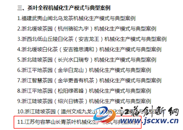 数据显示,句容市茅山茶场实施的“茅山长青茶叶机械化生产模式”名列其中。全国此次推介“茶叶全程机械化生产模式与典型案例”的茶企共11家。茅山茶场成为江苏茶企推介的唯一一家。
