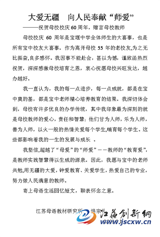 江苏创新网讯 惊悉我国伟大的教育家洪宗礼在3月4日6时48分逝世,他的家乡宝堰镇上下深感悲痛。洪宗礼出生在镇江市丹徒县宝堰镇堰东村(现宝堰村),他热爱家乡,热爱祖国。1955年之前一直在宝堰生活、学习。