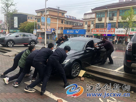 江苏创新网讯(图文/尹君) 4月3日下午3时左右,句容市后白城管中队执法队员王松、张翔、肖永康三人正在后白镇商城路路口进行道路巡查时,发现一辆黑色的小轿车整个车头栽入路牙台阶下,车主正在雨中用力的推,车辆却纹丝不动。