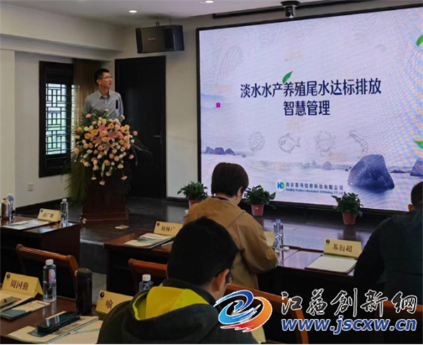 在本次活动专题报告会上,南京万瑞环境科技有限公司和南京混沌信息科技有限公司分别就“微生物+三水共治系统”在养殖尾水治理领域的应用、淡水水产养殖尾水达标排放智慧管理等技术作了详细解读;会后,与会人员观摩了窑湾镇环骆马湖三个点的鱼塘养殖尾水处理现场。