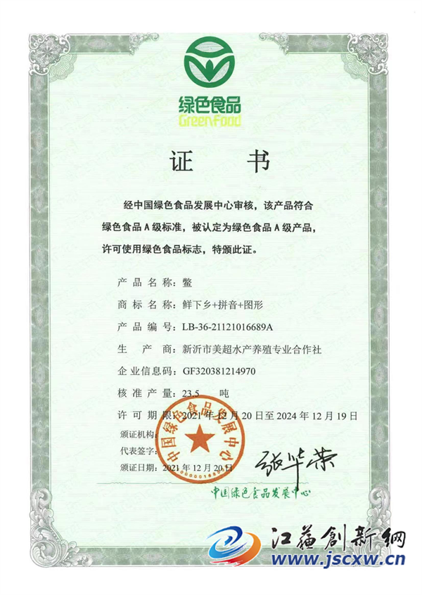 合作社因一直贯彻零用药、少用药,连续多年年接受省市县三级抽检,均无药物残留。2021年,经第三方谱尼测试集团检验产地环境及产品均为合格,达到国家“绿色食品”等级,获得中国绿色食品发展中心颁发的绿色食品证书。2022年,合作社投资530万元对现有的进排水通道进行了疏通,采用“三池两坝”的方法,对养殖尾水进行生态化处理,达到淡水养殖Ⅱ类标准,实现循环使用。2023年3月,合作社“鲜下乡”品牌在江苏红名优水产品评比中获得江苏省优秀企业产品品牌。