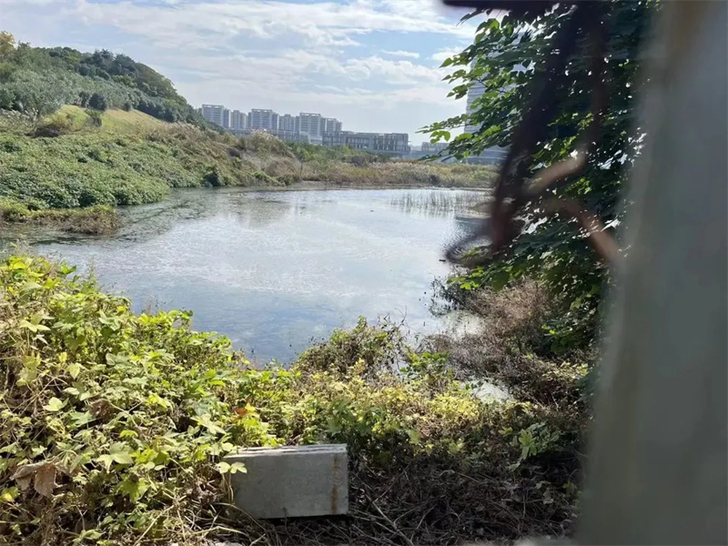池塘的水已泛黑色,围挡上贴着“存在污染风险”