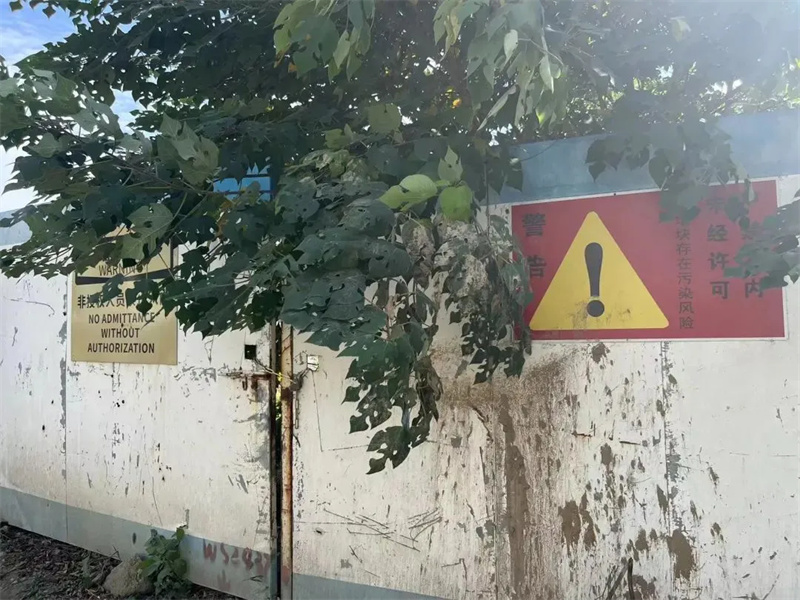 在原苏钢厂的焦化区内,2号地块上建成的苏州雷丁学校,门口只有安保人员;3号地块闲置未开发,检测到污染最严重的4号地块完全荒废,门上贴着“本地块存在污染风险,严禁入内”标识,芦苇生长得比围墙还要高,池塘中的水体呈黑色,泛着灰色亮光。
