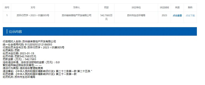 很快,2023年1月和7月,绿岸地产收到了环保部门的两张罚单,合计约545万元。