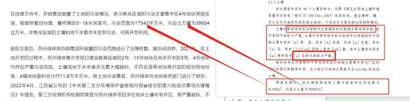 《上海陆家嘴金融贸易区开发股份有限公司重大资产购买报告书草案》中明确列出,根据苏州市环境科学研究所及苏州市苏城环境科技有限责任公司出具的《江苏苏钢集团老区(除未关停焦化区域)土壤污染初步调查报告》以及《江苏苏钢集团老区焦化区域场地污染详细调查报告》等报告,苏钢老区(除焦化区域)土壤和地下水基本未受到污染,可进行再开发利用;苏钢老区焦化区域场地污染主要集中在焦化区的污水处理区和粗苯车间,土壤污染主要集中在0-18米深度内,污染范围17,542平方米,污染土方量39,604立方米。