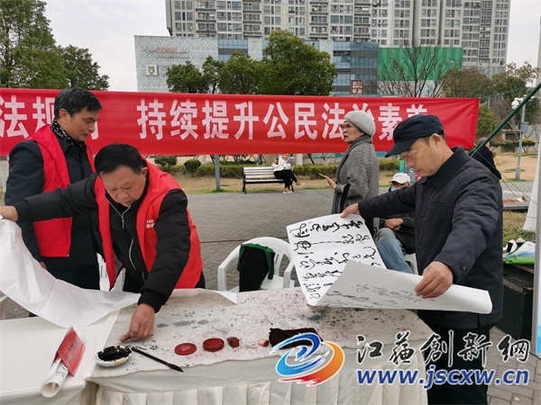 句容市老年书画协会公益普法组织的书法专家们一大早就来到广场,挥毫泼墨字字珠玑。广场分为几个区域,宪法广场展示区、宪法文化科普区、宪法书画作品区和法律知识咨询区。其中,宪法广场展示区设有宪法主题宣传板、宣誓墙、普法成员单位成果展示。