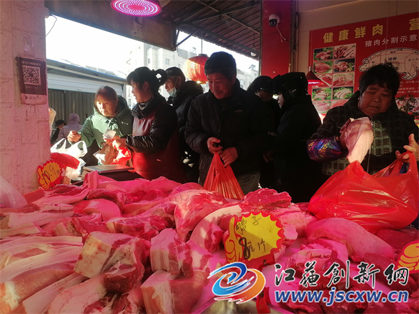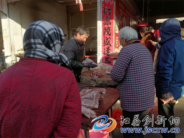 “小周,我来拿我家的50斤香肠……”,“魏老板娘,给我来30斤腌制好的五花咸肉,你家五花……咸肉蒸小葱很好吃……”。12月2日清晨,位于镇江市丹徒区宝堰菜场西门的周家肉店门庭若市,从早晨6点左右到中午11点基本上都是被顾客围得水泄不通,周家肉店6个人忙得头都抬不起来,这几天虽然气温降至冰点,但6个人都是满头大汗,生意火爆至极。