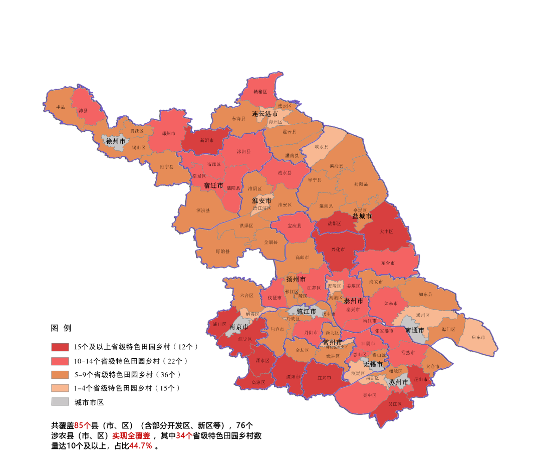 至此,江苏省特色田园乡村数量已达752个,其中2023年度命名159个,超额完成省政府民生实事提出的“创建130个省级特色田园乡村”的目标任务,完成率122.3%。76个涉农县(市、区)中,省级特色田园乡村数量达10个及以上的有34个,占44.7% 。