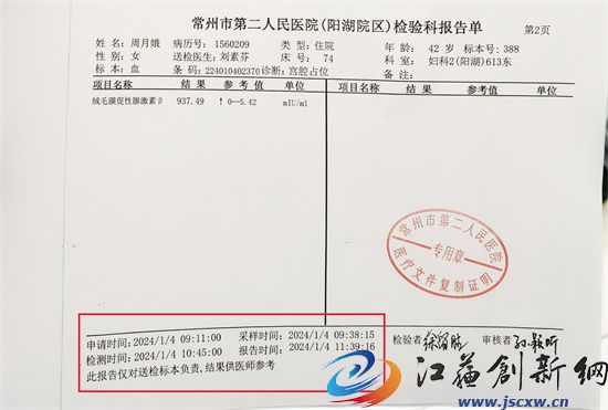 周女士爱人1月8日早上办理出院时,曾向医生要检验报告回复说没有,得等到复查时再给我们。直到手术出院第二天晚上了,也就是1月9日晚上医生打电话来却说抽血检验结果是怀孕状态。为查看检验报告到底是什么情况,当晚8点左右,周女士爱人赶到医院一楼大厅检验报告打印设备处欲打印检验单,结果仍然显示“医生审核中,请耐心等待,注意取报告时间”。