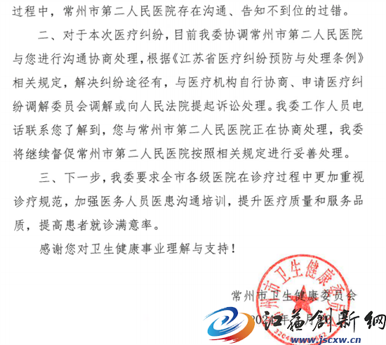 在周女士同常州二院阳湖院区无实际沟通结果的情况下,随即向常州市卫健委反应情况。卫健委认定为:“诊疗过程中,常州市第二人民医院存在沟通、告知不到位的过错,”并且表示:“我委工作人员电话联系您了解到,您与常州市第二人民医院正在协商处理,我委将继续督促常州市第二人民医院按照相关规定进行妥善处理。”