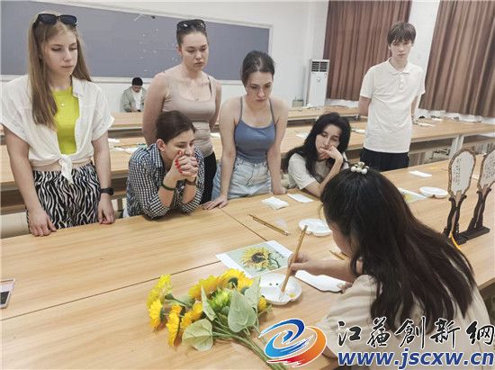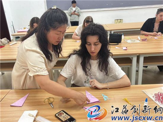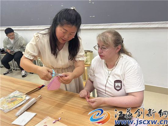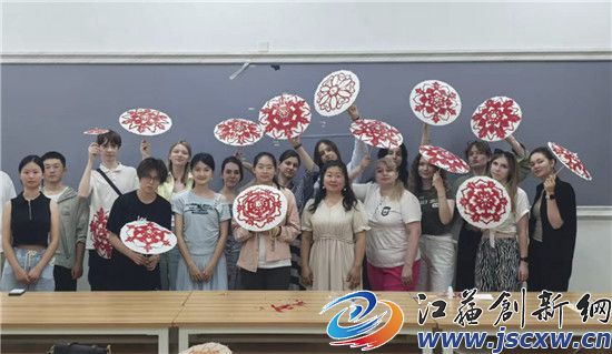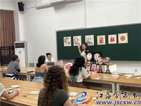江苏创新网讯 2025年6月26日 江苏第二师范学院溧水校区内,来自俄罗斯众多留学生现场向非遗传承人原卫妮学国画团扇,剪纸伞。