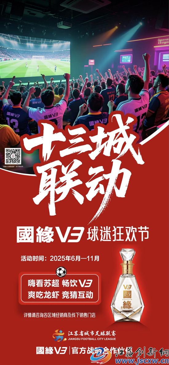 国缘V3作为江苏省城市足球联赛第一家官方战略合作伙伴,每场赛事的现场3—5万人狂欢,“国缘V3加油棒”“国缘V3”助威旗形成红海洋。
