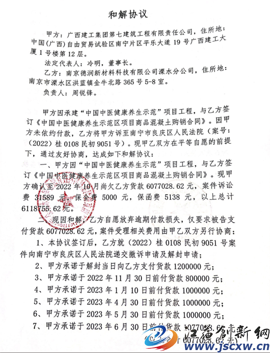 广西建工集团第七建筑工程有限责任公司(甲方),住所地:广西自由贸易试验区南宁片区平乐大道19号广西建工大厦1号楼第 12 层。法定代表人:冷明,董事长。南京德润新材料科技有限公司溧水分公司(乙方),住所地:南京市溧水区洪蓝镇金牛北路365号5-8室。负责人:周锐锋。