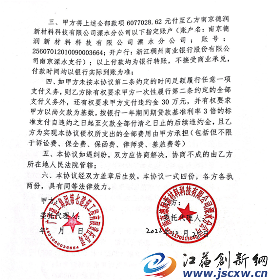 施工工程中,出卖方南京德润新材料科技有限公司溧水分公司严格遵守《合同》约定,不折不扣保质保量按期交货,且出具双方均认可的销售明细清单和对账单。至2021年7月,甲方欠乙方货款6077028.62元逾期未依约付款,乙方将甲方诉至南宁市良庆区人民法院(案号:(2022)桂0108民初9051号)。