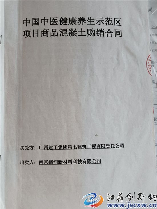 2021年1月25日,广西建工集团第七建筑工程有限责任公司作为买受方和出卖方南京德润新材料科技有限公司溧水分公司,签订了《中国中医健康养生示范区项目商品混凝土购销合同》。《合同》在合同标的物、质量标准、交货方式及时间、货物数量及质量的验收、付款方式和时间、税票要求、违约责任、争议解决及其他等方面具体约定。