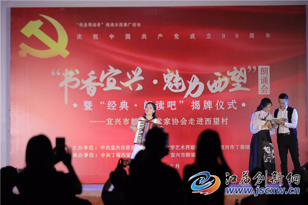 “一条游船 劈开了南湖的波浪 十几个热血青年 在运筹一个红色的理想 ……”“我志愿加入中国共产党,拥护党的纲领,遵守党的章程,履行党员义务,执行党的决定……” 深情的回忆与诉说,铿锵有力的誓言,轻快动人的歌声,“书香宜兴·魅力西望”朗诵会暨“经典·朗读吧”揭牌仪式在这里举行。一个个精彩的节目让村民朋友们不时爆发热烈的掌声。