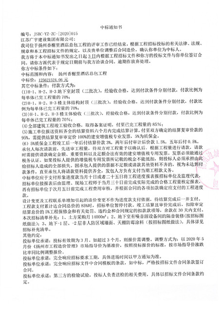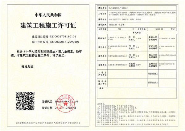 2017年12月29日,扬州市邗江区城乡建设局就772地块H区酒店项目颁发建筑工程施工许可证,载明合同工期为500天。