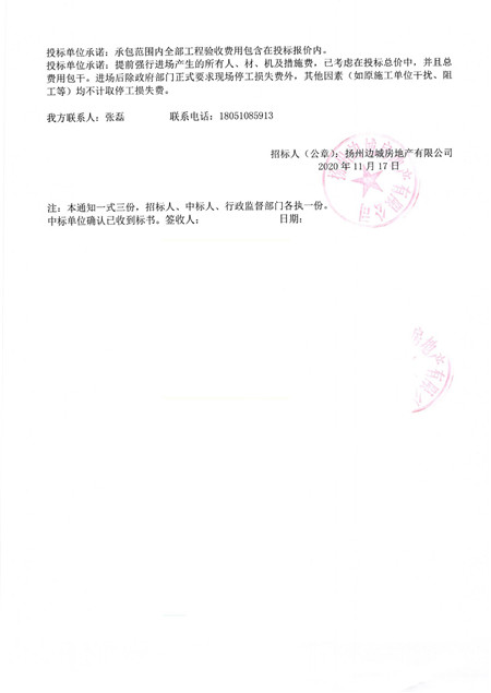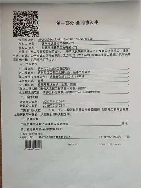 2017年11月6日,扬州边城房产与江苏华城建筑工程有限公司双方签订了《建设工程施工合同》,约定将扬州772地块H区酒店项目的桩基及基坑支护、土建、安装工程交由华城建筑公司施工。合同约定工期500天,计划完工时间为2019年3月22日,签约合同价为人民币1.5亿元等内容。