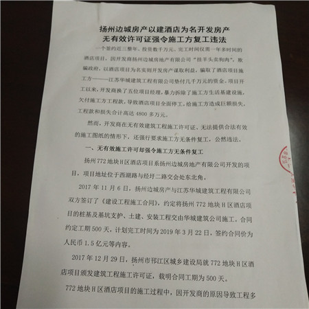 扬州边城房地产有限公司的种种不诚信和违法行为,欺骗了地方政府和规划、土地、建设管理部门,损害了政府形象,也严重侵害了施工方的利益。在此,施工方为维护合法权益,借助媒体力量和社会舆论,抨击开发商不诚信欺诈违法行为: