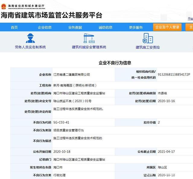 据海南省住房和城乡建设厅——海南省建筑市场监管公共服务平台发布的企业不良行为信息显示:江苏南通二建集团有限公司新月·南海嘉园(原明光·新领域)施工过程中违反质量安全技术规范。被海口市琼山区建设工程质量安全监督站处罚,扣2分。