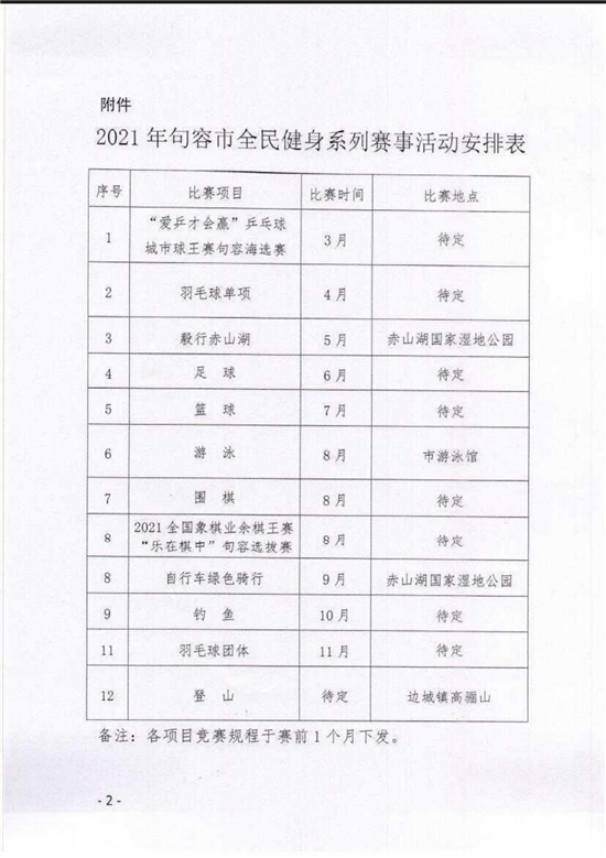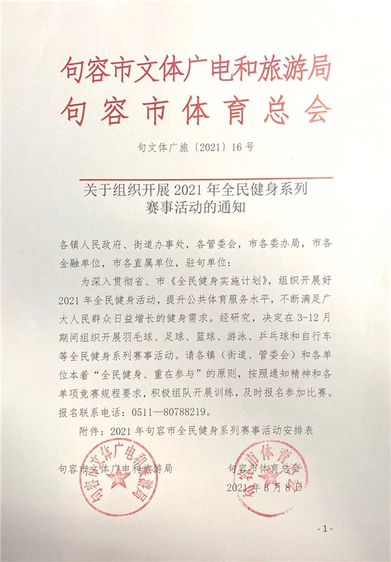 江苏创新网讯 (翟延露)日前,句容市文体广电和旅游局制发《关于组织开展2021年全民健身系列赛事活动的通知》文件。为深入贯彻省、市《全民健身实施计划》,组织开展好2021年全民健身活动,提升公共体育服务水平,不断满足广大人民群众日益增长的健身需求。经研究,决定在3-12月期间组织开展羽毛球、足球、篮球、游泳、乒乓球和自行车等全民健身系列赛事活动。