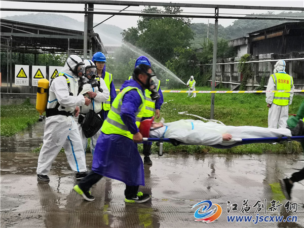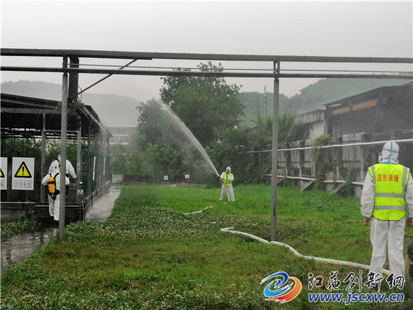 三时许,雨势忽然加剧,倾盆如注,面对突至的暴雨,演练丝毫未受影响,虽然各小组成员全身透湿,仍按预定方案紧张有序、有条不紊进行。与此同时,句容生态环境局接到情况汇报后立即启动应急程序并向镇江市局汇报,安排环境应急和监测人员第一时间奔赴现场积极响应。