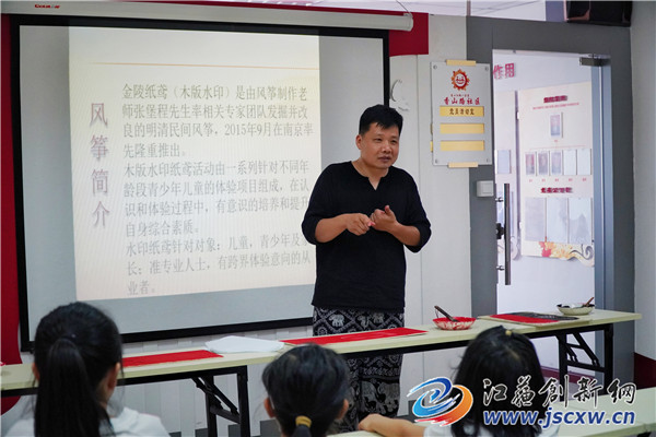 下午15时30分,金陵纸鸢非物质文化传承人张堡程正在活动教室里为孩子们讲述纸鸢的“前世今生”。