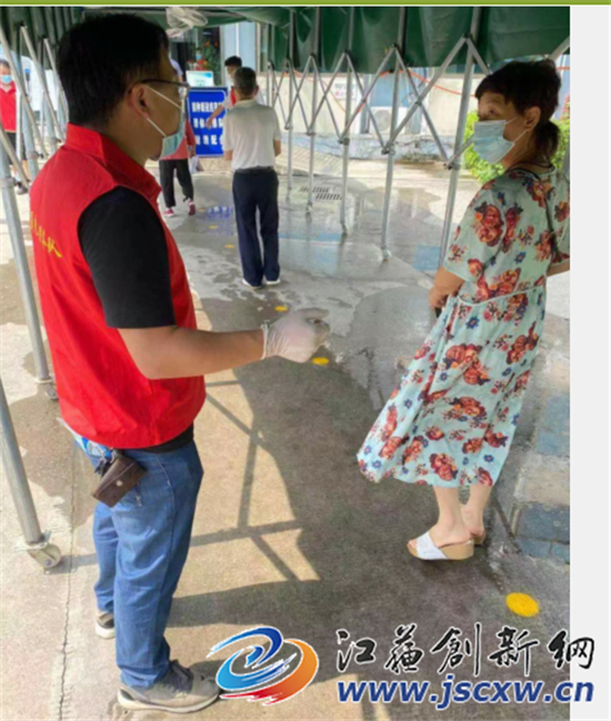 “请大家依次排好队,佩戴好口罩,保持安全距离,避免交谈,”在宝华镇同城世家广场检测点,高温下的罗荣军一边认真的引导着群众打开健康码、行程码,一边还要不时地安抚个别情绪急躁的群众,遇到在登记上有疑问的群众,尤其是老人和孩子,还要一遍遍的帮助他们进行操作,快速完成登记。8月4日,宝华镇进行全员核酸检测演练。为了保障检测工作的顺利开展,刚过凌晨4点,天还未亮,罗荣军看了眼还在熟睡中两个年幼的女儿,便悄悄出了门。从清晨忙到深夜,一天下来,连口罩都是湿漉漉的。