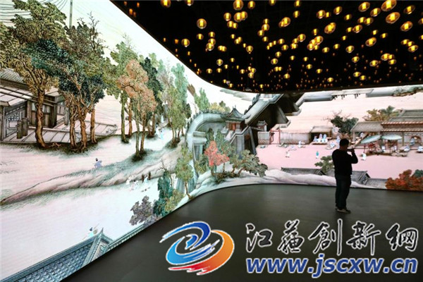 步入场馆,映入眼帘的便是巨幅的“数字画卷”,在全长近110米、高3.6米的大屏幕上,可以看到《金陵图》这幅长卷被放大了百倍,且不仅是简单地把画放大进行动态呈现,技术团队还首创了“人物入画,实时跟随”的互动观展模式,让观众可以真正的“走进”古画,与533个“画中人”互动交流。