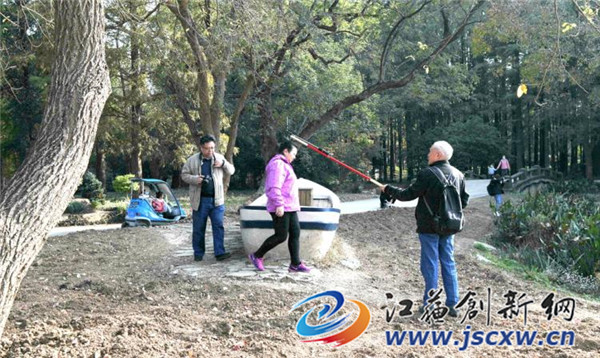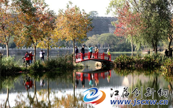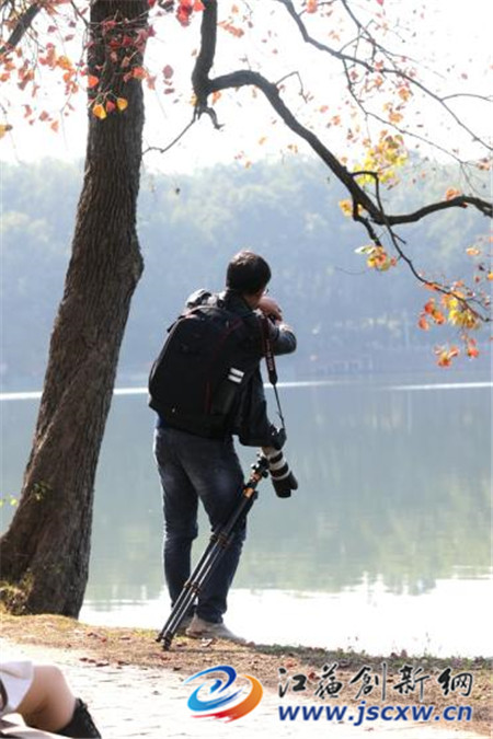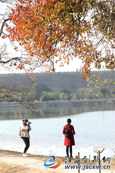 又是一个周末,无数南京市民和外地游客,一大早便赶来这里赏景、采风。一湾浅水中,蜿蜒着一条月牙形状的湖堤。堤岸上乌桕的红、银杏的黄倒映在如镜般的湖水中,折射出的秋景分外美丽。