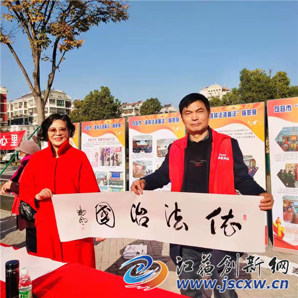 剑胆琴心是司法行政系统干部应有的精神风貌,句容市老年书画协会是句容市社会普法的公益团队。书画协会会长刘传林带领的书画专家在第八个国家宪法日到来之际大显身手,一场“书画搭台,普法唱戏”的雅集广场普法宣传活动顺利展开。