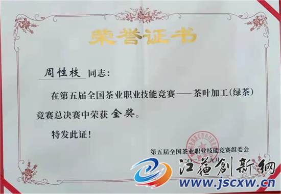 江苏创新网讯 近日,由中国茶叶学会、中国就业培训技术指导中心、农业农村部人力资源开发中心主办的第五届全国茶业职业技能竞赛——茶叶加工(绿茶)总决赛,江苏选拔推荐的句容市选手周性枝获大赛金奖。