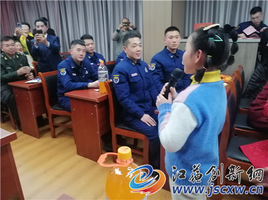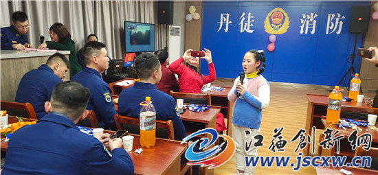 现场来自老区宝堰的10岁小歌手曹应琦说:“平时这些英雄的事迹只是在书本上或听老师说过,今天现场见到了这么多的英雄叔叔,他们为了保卫人民赴汤滔火,太震撼、太伟大了!”随后,曹应琦小朋友来到消防战士们中间,用婉转美妙的童声给消防官兵们演唱了一首红色经典歌曲《映山红》。消防战士们听了这优美的旋律、动听的歌声,一扫疲劳开心地鼓起掌来,将小型迎新年晚会推上了高潮,据了解,丹徒消防大队整台小型迎新年晚会是镇江兴乐市政工程有限公司陈正乐先生赞助的。