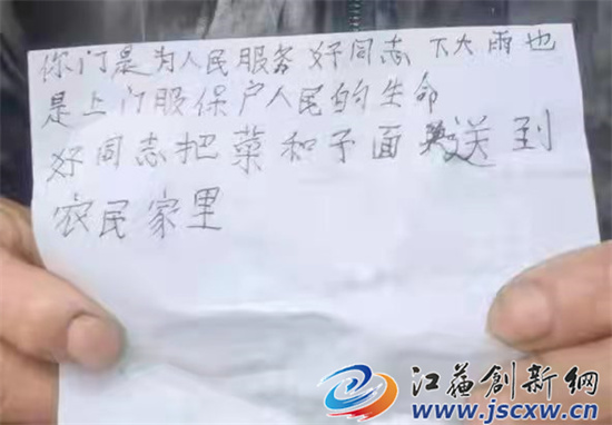 这张很普通甚至很粗糙的文字大意是:“你们是为人民服务的好同志,下大雨也上门为我们做核酸检测,已经几次为我们服务,保护人民的生命,除了不厌其烦为我们做核酸测体温,这些好同志还把菜和面送到农民家里……”。短短几行字道出了老百姓的心声。这位老人为什么要通过写纸条的方式感谢他们呢?原来是因为这个村民早年喉咙做过手术,一直发不出声来,只能通过写纸条交流。