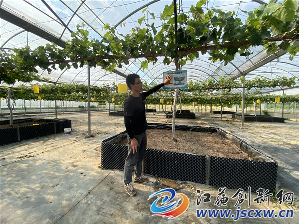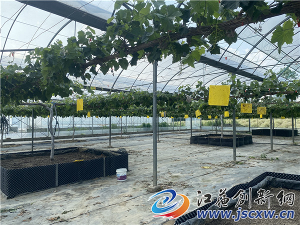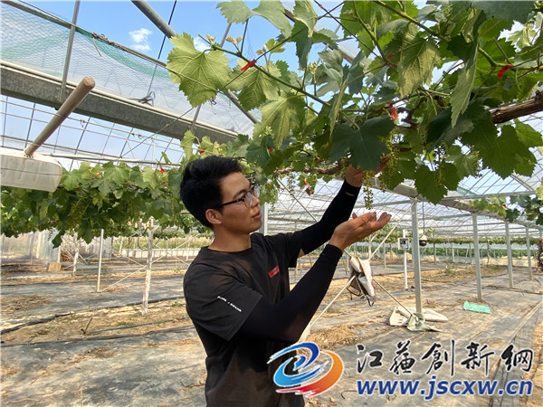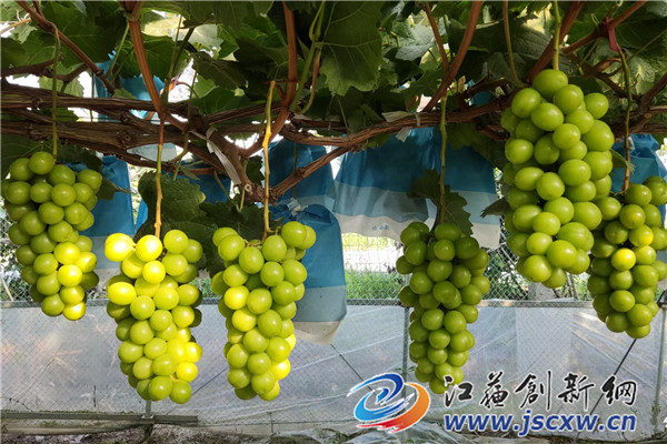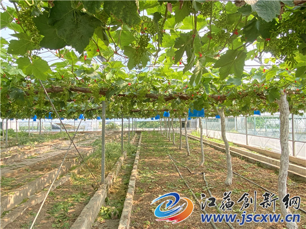 江苏创新网讯 5月,葡萄生产进入关键期,位于句容市江苏农博园内的新禾果园里热火朝天,公司负责人岳建涛正在大棚里查看葡萄长势,对阳光玫瑰等葡萄进行疏果。