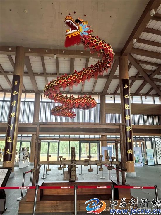 沿着湖边前行,来到赤山湖灌溉工程展示馆。一进馆,一架 5 米长的龙骨水车便映入眼帘,它静静地伫立在那里,仿佛在诉说着古代农业的智慧与艰辛。遥想当年,先民们依靠人力驱动着这架水车,将湖水引入农田,滋润着干涸的土地,孕育出了丰收的希望。与龙骨水车遥相呼应的,是穹顶上盘旋着的一条红色巨龙,它代表着赤山湖先民们朴素的水神崇拜活动 —— 龙舞 “二龙戏珠”。在古代,人们对自然充满了敬畏之心,他们相信通过龙舞等祭祀活动,可以祈求风调雨顺、五谷丰登。如今,郭庄镇芦亭村三阳龙舞队闻名全国,1999年参加北京《国安杯》龙舞大赛,获得金奖,并应邀参加了澳门回归大型龙舞晚会。这些古老的传统和信仰,依然在这片土地上延续着,成为了赤山湖文化的重要组成部分。