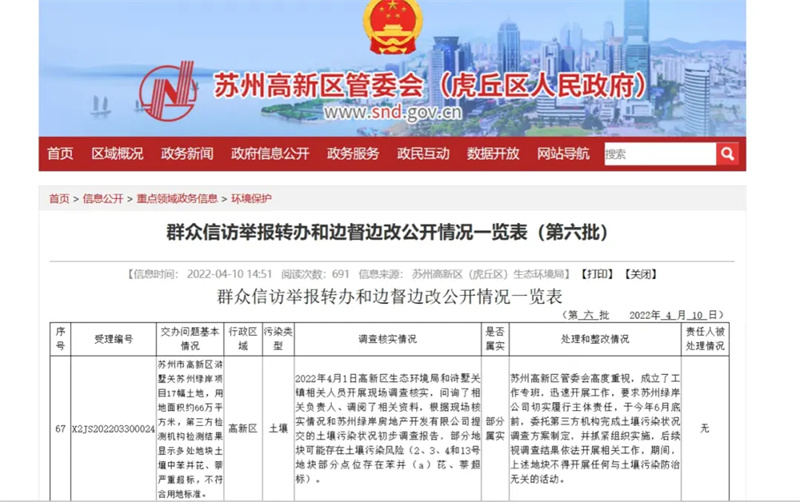 时隔6年,2022年4月,江苏省公布的《中央第二生态环境保护督察组向我省移交的第六批信访事项办理情况》中提到,第三方检测机构检测结果显示,苏州绿岸项目多处地块土壤中苯并芘、萘严重超标,不符合用地标准。