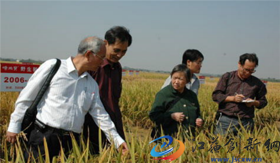 左1:国际水稻研究所中国代表处首席代表汤圣祥;左2:国家有特殊贡献的水稻专家、全国人大代表王腾金;左3:中国农科院有特殊贡献的水稻专家庞汉华;右1:广西农科院有特殊贡献的水稻专家陈成斌。