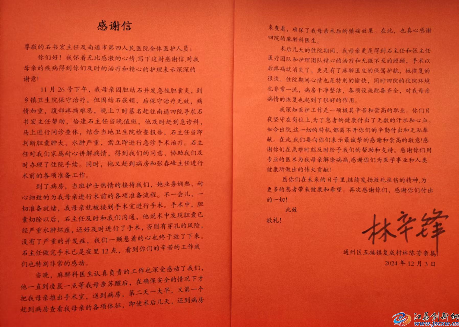 江苏创新网讯 12月3日,南通市通州区五接镇复成村林陈芳老人的家属向南通市第四人民医院发来一封饱含深情的感谢信,对医院在林陈芳老人突发胆囊疾病时给予的及时救治和精心护理表达了诚挚谢意。