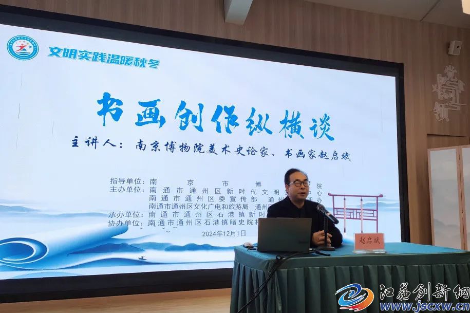 12月1日,南京博物院著名美术史论家、书画家赵启斌在风景秀丽的渔湾水乡风景区开展了一场书画讲座。